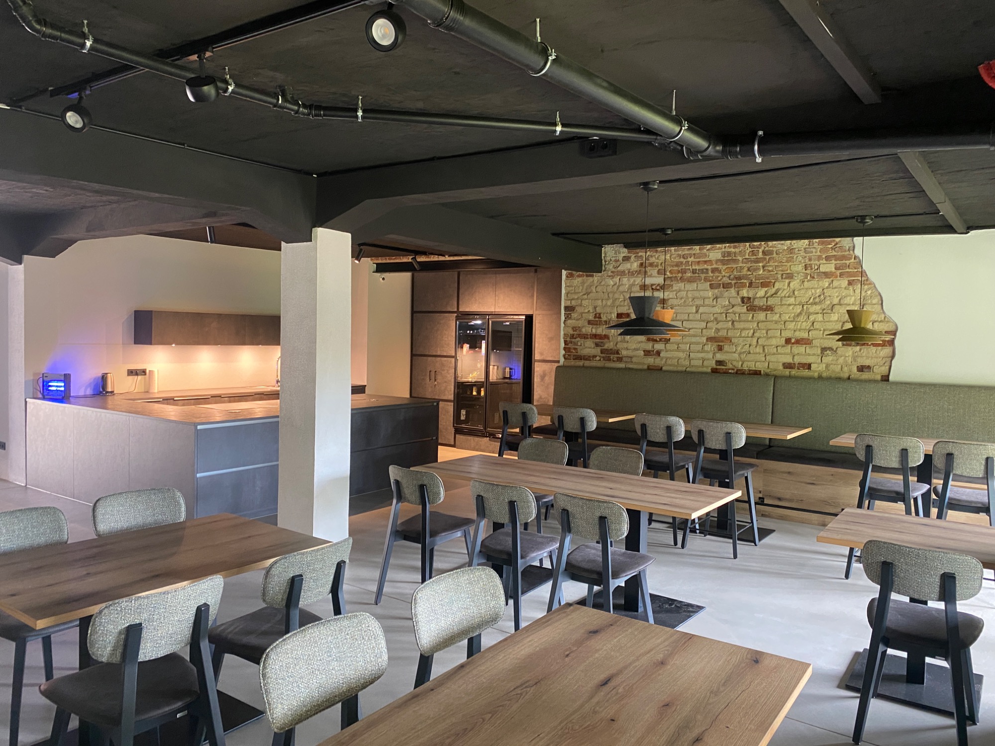 Auch die schwarze Decke war anfangs ein mutiger Schritt. Sie lässt die sichtbar geführte Haustechnik optisch in den Hintergrund treten und sorgt für Ruhe im Raum.. Die Sorge, eine so dunkle Decke könnte drückend wirken, hat sich nicht bestätigt.