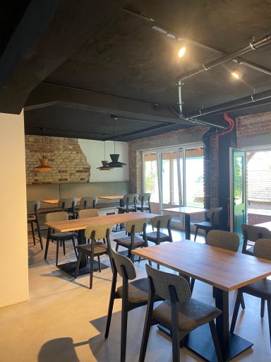 Die drei markantesten Materialien in der heutigen Kantine sind die schwarz gestrichene Decke, die originalen Mauerwerkswände sowie der neue Sichtestrich. Drei Materialien, die unserer Meinung nach sehr gut miteinander harmonieren und dem Raum einen roughen Industrial Look verleihen.
